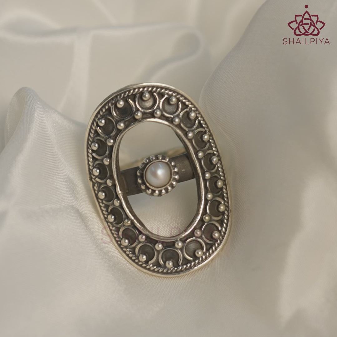 The Meera Embossed Thik Rawa Pearl Oval Ring is a timeless piece that unites elegance with heritage craftsmanship. Handcrafted in 92.5 sterling silver, this ring features intricate embossed rawa detailing framing a luminous pearl centerpiece. The oval design enhances the natural grace of your fingers, while the oxidised silver finish adds a touch of vintage charm.