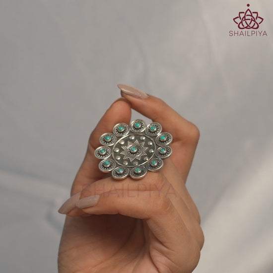 Each petal-like detail is meticulously carved, forming a floral sunburst design that radiates charm and strength. The oxidised silver base highlights the intricate work, while the turquoise stones add a touch of colour and spiritual calmness. A true celebration of heritage and modern elegance, this ring is a versatile treasure for every jewellery lover.
